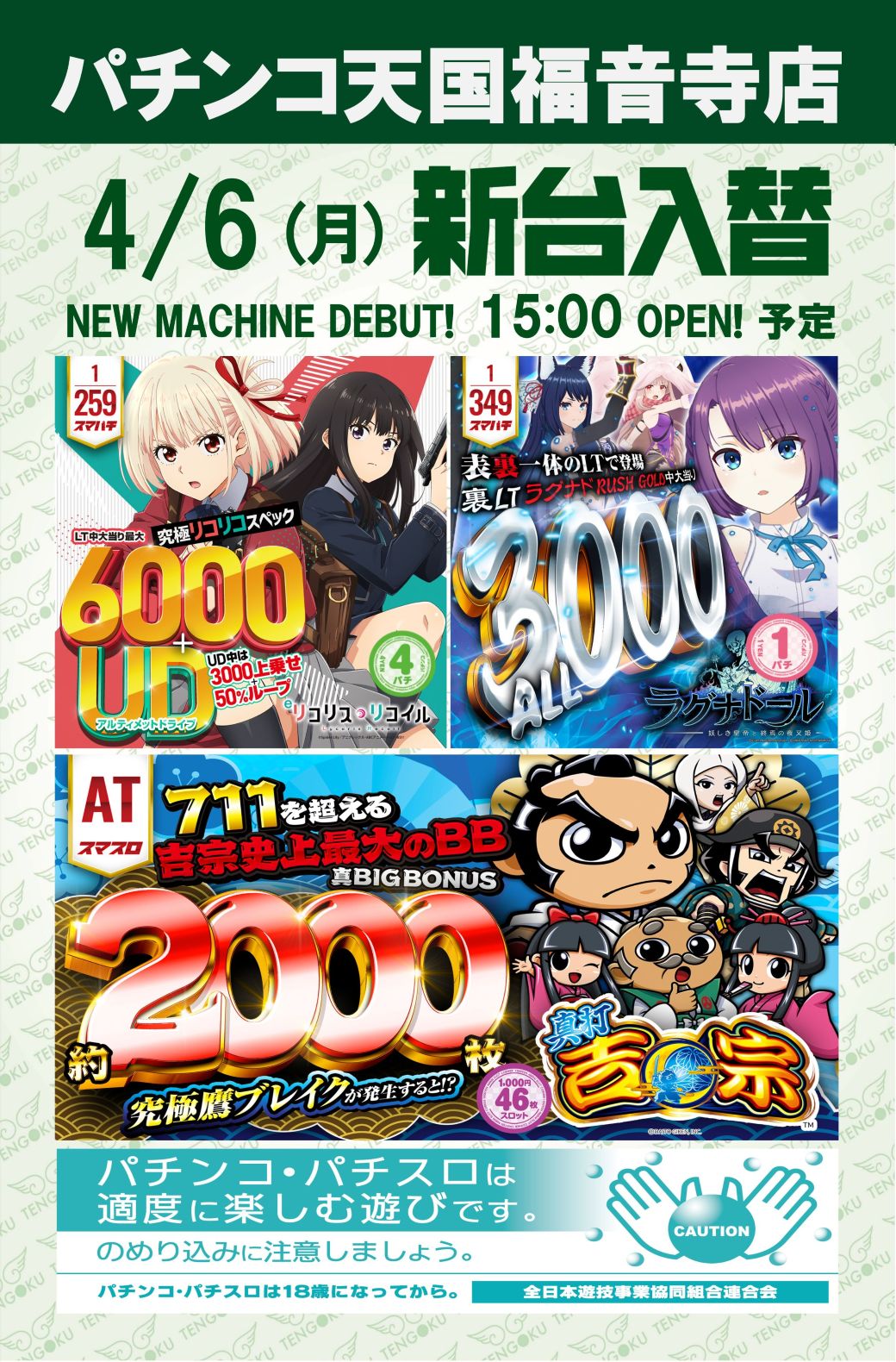 4/6(月) 新台入替 新台入替 福音寺店 福音寺店 4/6(月) 新台入替をラッキードルバくんがお知らせ! 🌟🎉ラッキードルバくんがパチンコ天国福音寺店新台入替のお知らせ🎉🌟 やっほー!ボク、ラッキードルバくんだよ😊✌️ みんな...