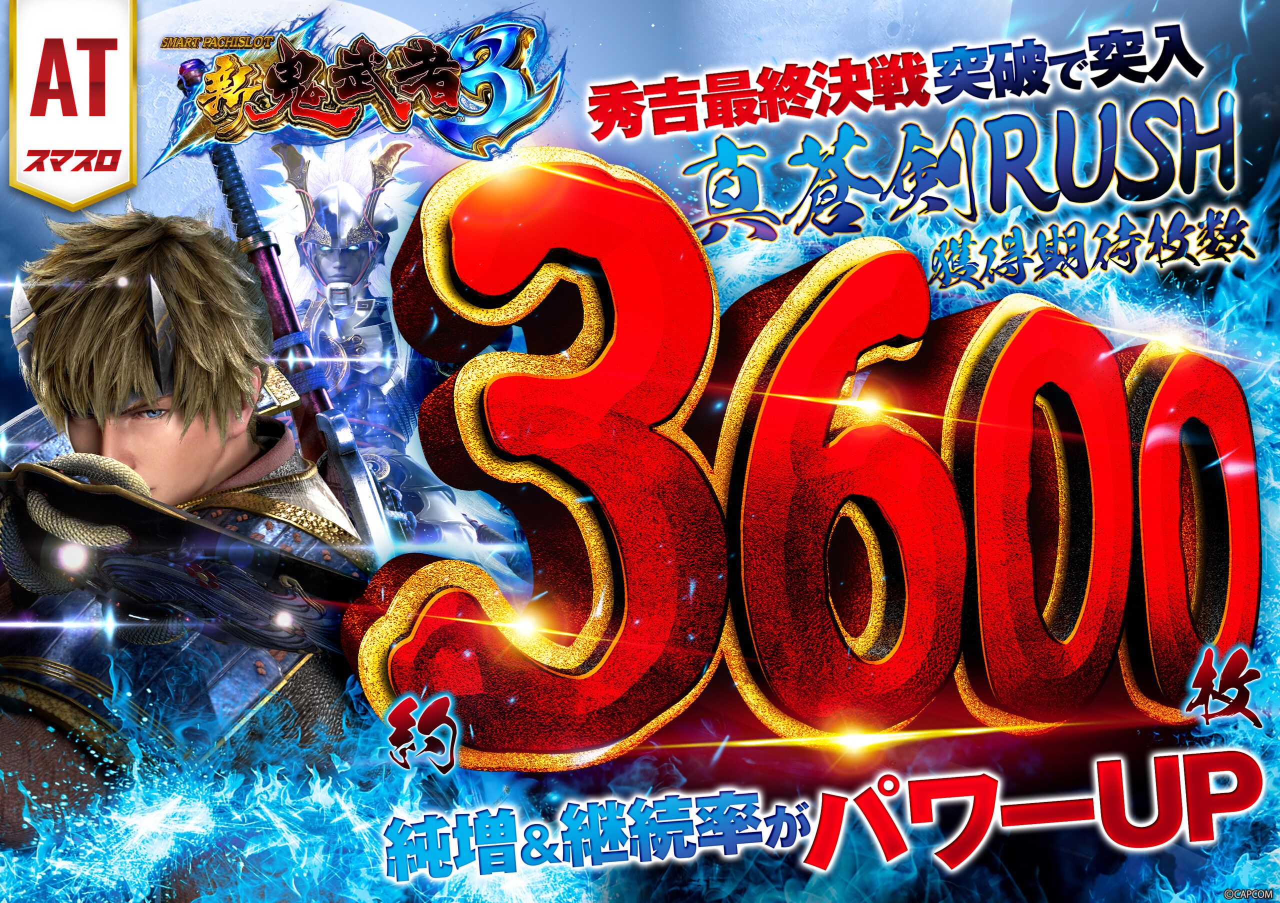 AT性能 / 出玉スピード通常AT(蒼剣RUSH)は純増約 2.5枚/G、上位AT(真蒼剣RUSH)では 約5.5枚/G にパワーアップ