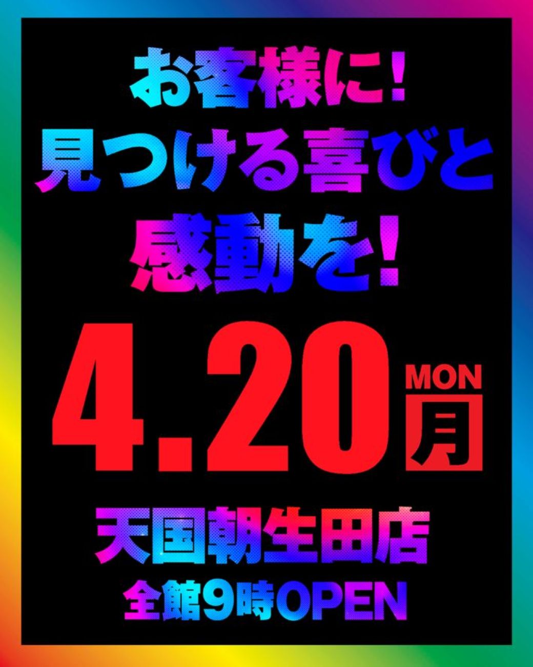 4. 天国朝生田店 4月20日(月) あさ9時オープン!(新台は15時予定) お客様に!見つける喜びと感動を!