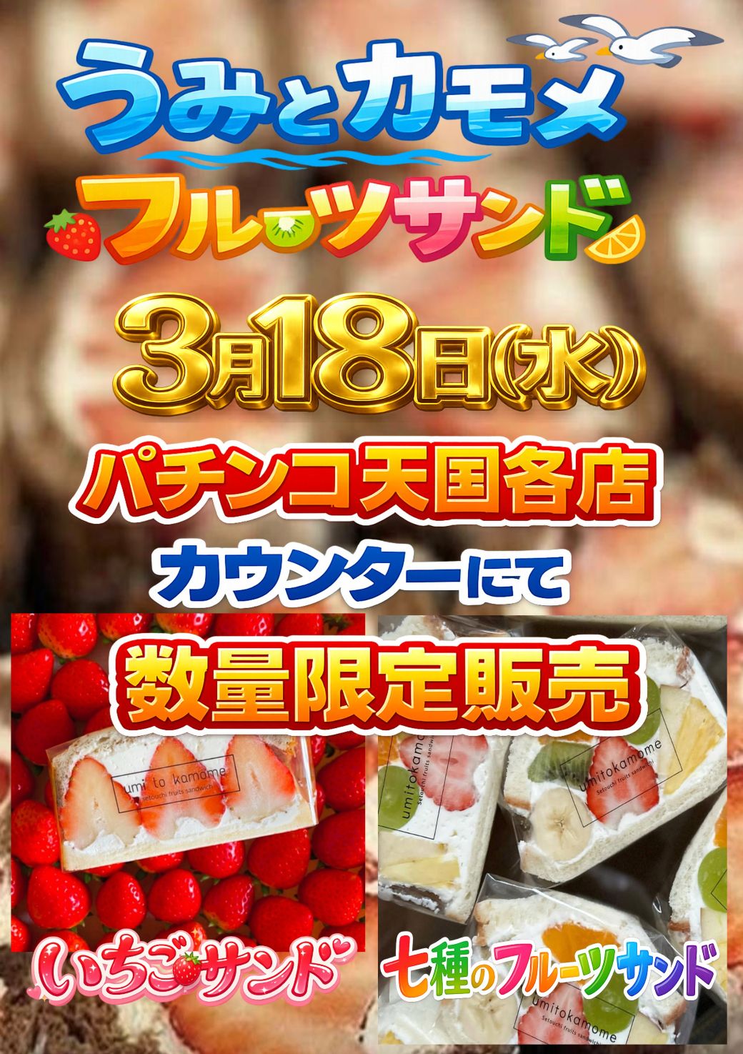 4. 愛媛県下天国グループ5店舗 3月18日(水) 店内にて【うみとカモメ】のフルーツサンド販売します!