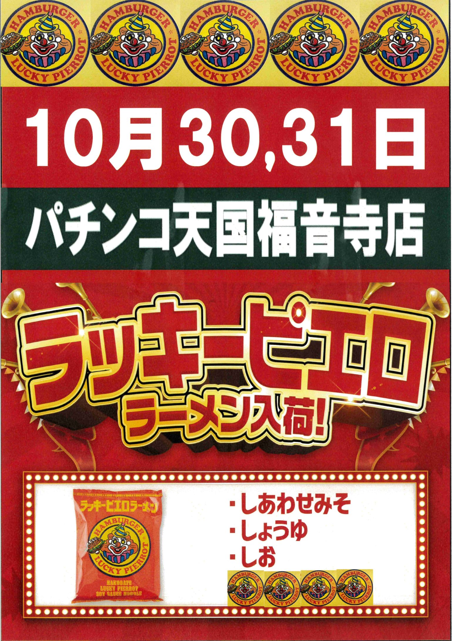 10月30日(木),31日(金)の2日間、天国福音寺店にラッキーピエロラーメン再び入荷!