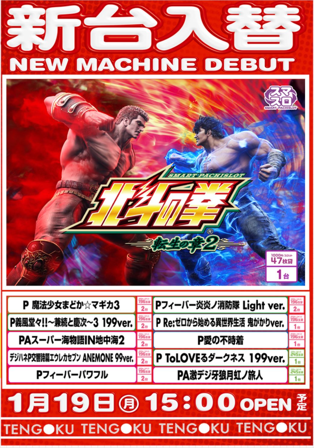 1月19日(月)は、ぜひ天国小松店で新台をチェックしてね😆‼️