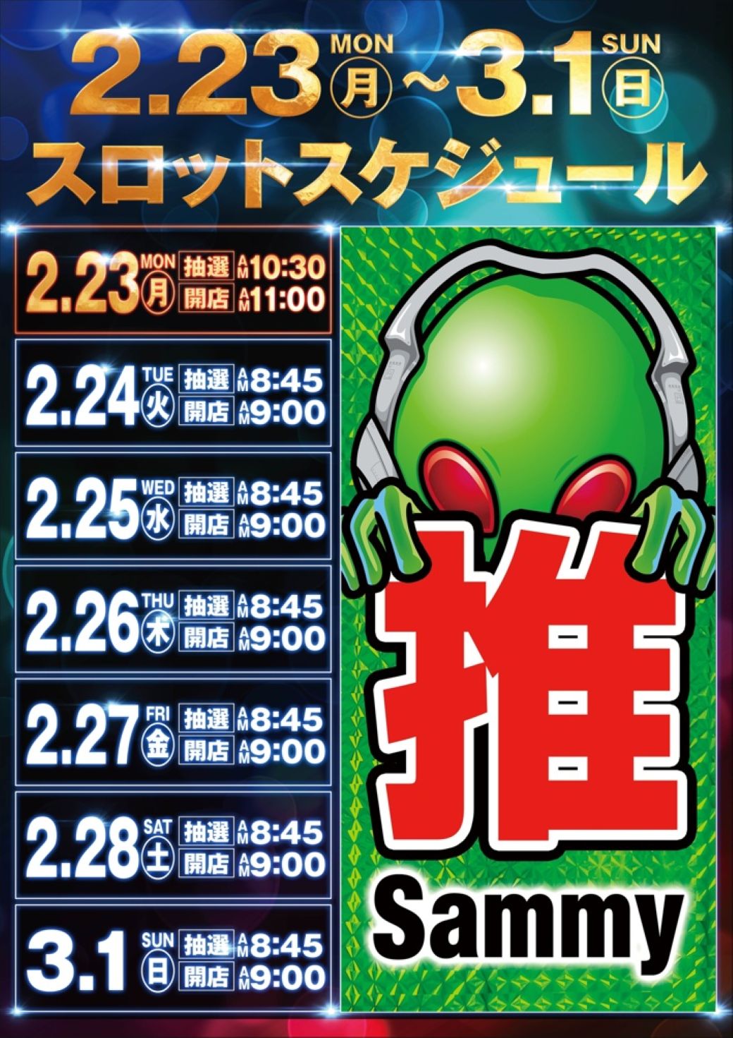 空港通店2/16(月)新台入替をラッキードルバくんがお知らせ