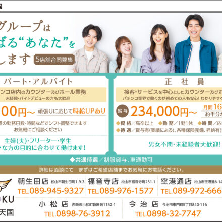愛媛県・大分県三重でパチンコ・スロットを楽しむなら、パチンコ天国グループへ!朝生田店・空港通店・福音寺店・小松店・今治店・大分三重店でお待ちしています!